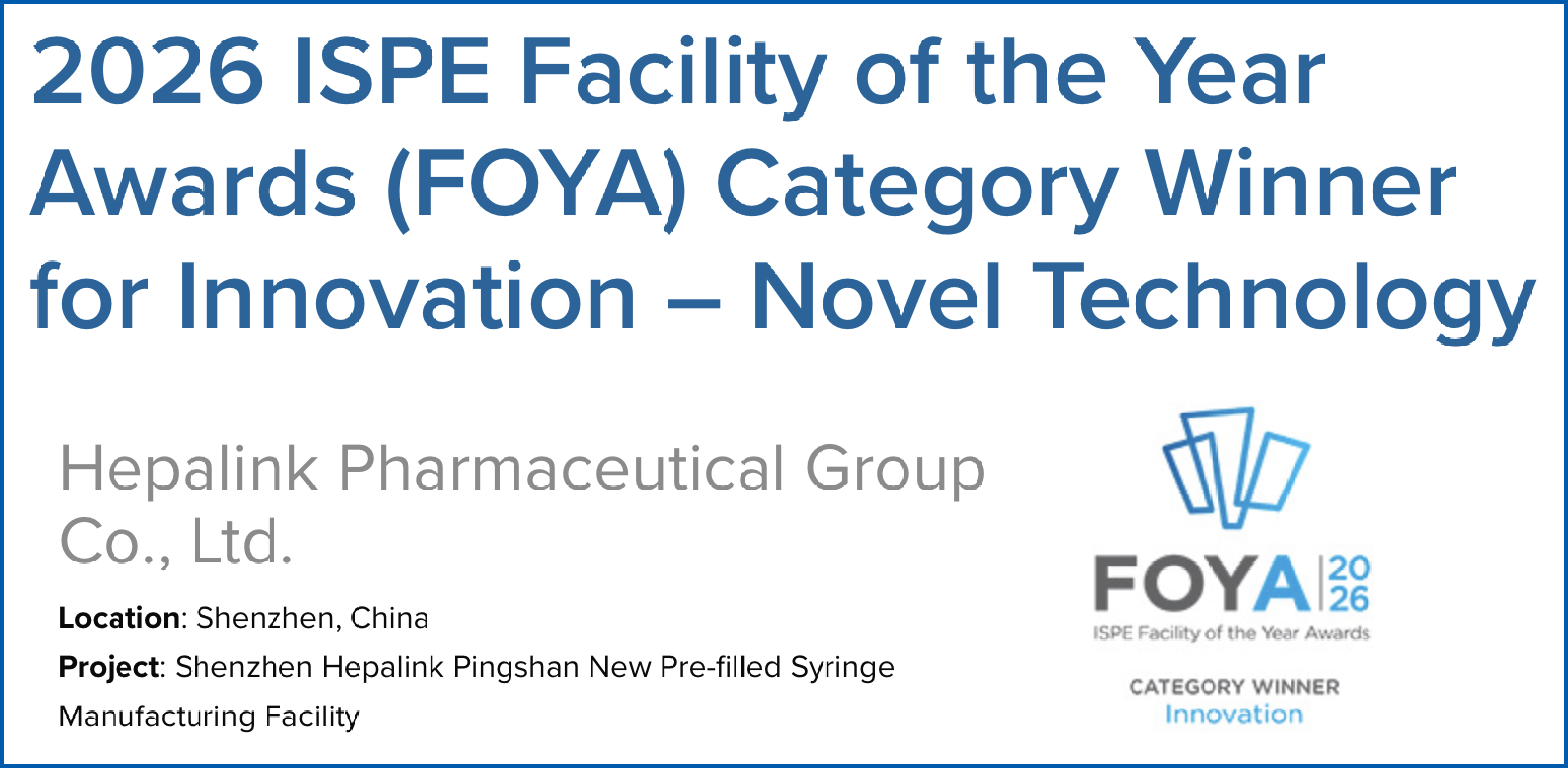 (2026年4月21日,中国深圳)近日,国际制药工程协会(ISPE)公布了2026年度设施奖(Facility of the Year Awards,FOYA)获奖名单。作为全球制药工程与医药制造领域的重要专业奖项,FOYA被誉为“医药设施奥斯卡”。海普瑞坪山新建预灌封制剂智造项目凭借在制剂产品制造领域的突破性创新,斩获“创新-新技术”(Innovation – Novel Technology)类别大奖,是本届获奖的唯一中国企业,也是FOYA设立20多年来,中国药企在境内建设的医药制造设施中唯一获此殊荣的项目,这意味着中国医药高端制造首次在全球最严苛标准中实现领跑。赛诺菲、拜耳、礼来、阿斯利康、武田等国际顶尖医药企业亦位列本届榜单。
