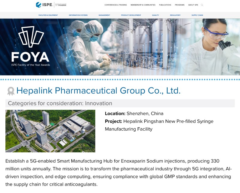 (2026年2月9日,中国深圳)在近日于美国圣地亚哥举办的2026“未来设施大会”上,国际制药工程协会(ISPE)正式公布2026“年度设施奖”(Facility of the Year Awards,FOYA)入围名单,海普瑞药业凭借坪山新建预灌封制剂智造项目成功入选,是本届入围的全球16强中唯一的中国企业,与赛诺菲、阿斯利康、拜耳、强生、默克等国际制药巨头共同跻身榜单,角逐这一被誉为“医药设施奥斯卡”的全球医药工程领域最具影响力奖项。此次入围,是中国智造登上国际舞台的又一里程碑,也是海普瑞药业“工业化平台”与“商业化平台”深度协同的集中体现。